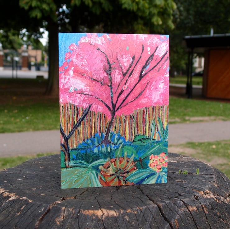 This card has been reproduced from my painting of the same name. I painted this picture during the spring and I wanted to capture, and celebrate, the multitude of colours and shapes that had suddenly bloomed after a long winter.