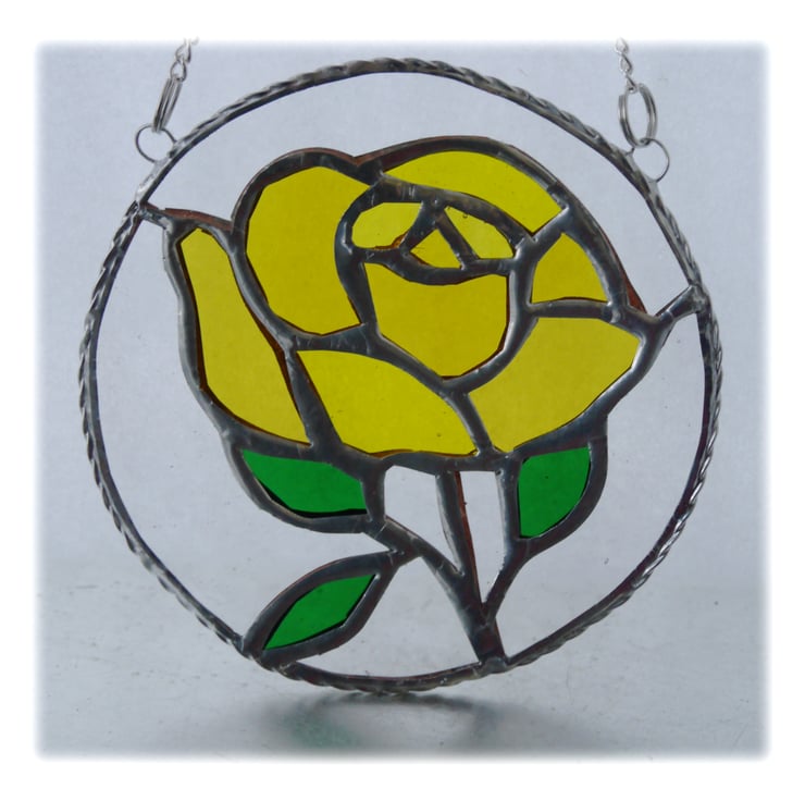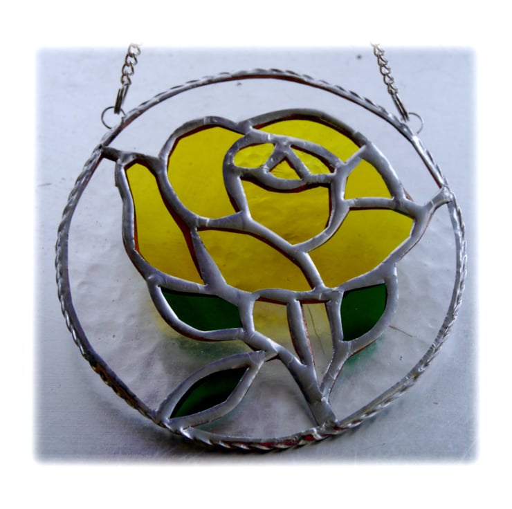 It is a simple full flowered rose made using several different shades and textures of yellow glass.