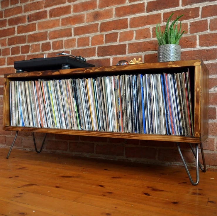 Our industrial vinyl units are hand made in Wales from solid Pine. We use our signature charring technique and a wax oil finishes for beautiful strength and durability. In this listing the unit is matched with thick, 12mm eames style hairpin legs legs in raw steel to match the industrial style.