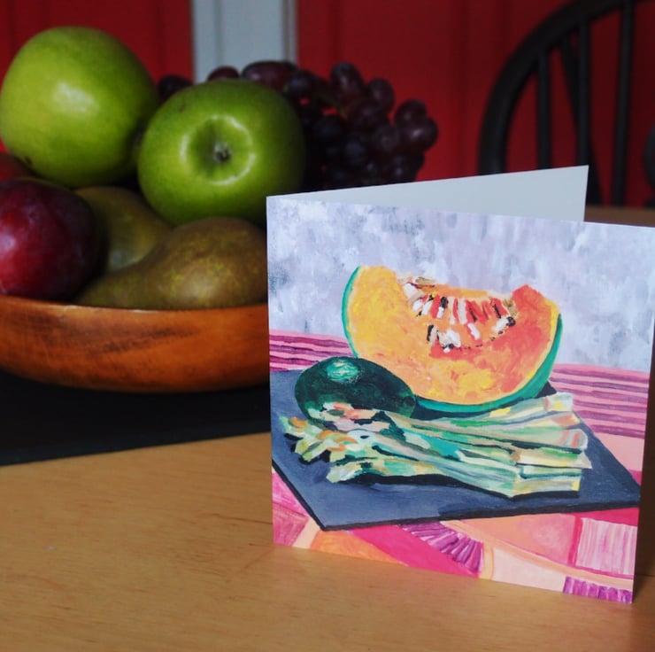 This is a reproduction of one of my paintings which is acrylic on canvas. The card is 125mm square and is blank for your own message. It comes packed in a clear cello bag with a white envelope.
