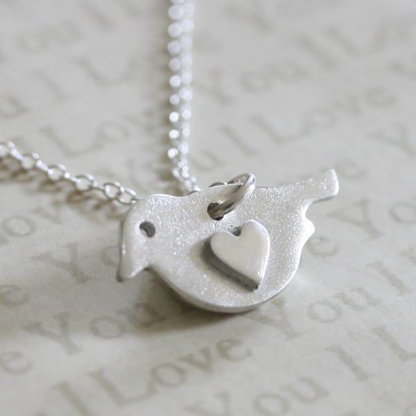 A very sweet little handmade fine silver bird necklace with a sterling silver chain.The body of the bird is a matt silver whilst the little heart on the front is shiny. The approx size of the bird is 24mm x 13mm.