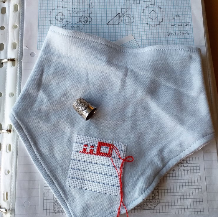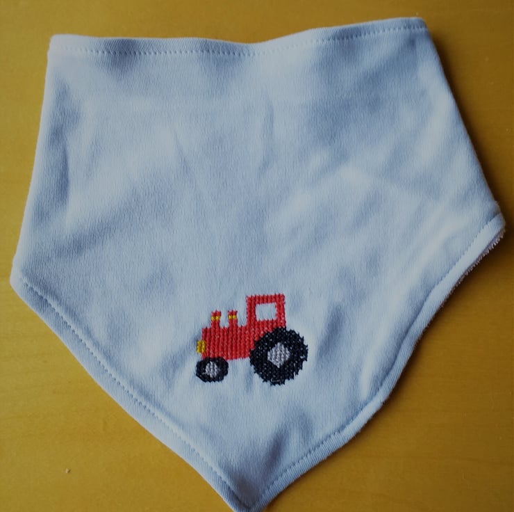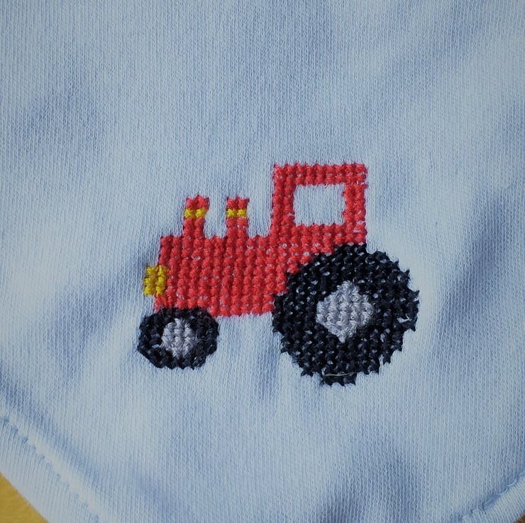 This is a pale blue Tu dribble bib upon which I have hand-embroidered a red tractor motif of my own design, It has an adjustable press-stud fastening, is cotton on the front, and polyester cotton on the reverse. The bib is machine washable at 40C.