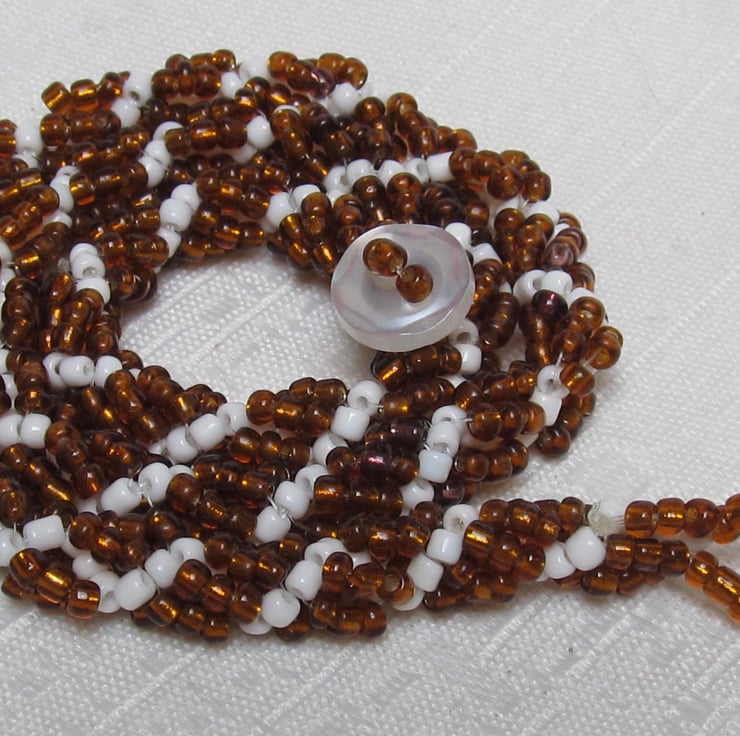 Warm Amber coloured seed beads are woven with white seed beads, showing off the spiral design of the weave.