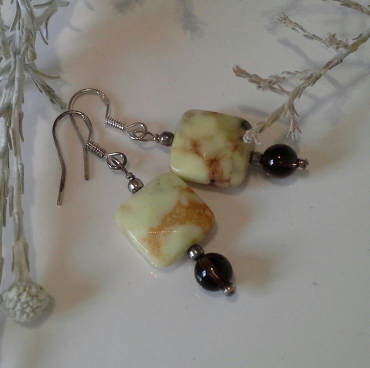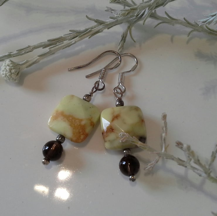 A lovely unique feminine pair of earrings designed and hand crafted using faceted pillow square treated lime jasper gemstones with exeptional quality clear smokey quartz genuine gemstone round cut beads. The earrings have been hand wire wrapped using all 925 sterling silver components.