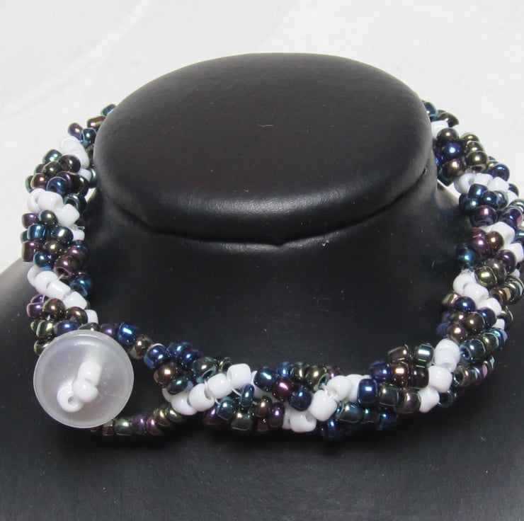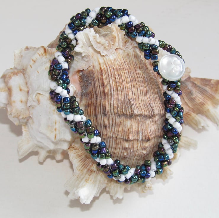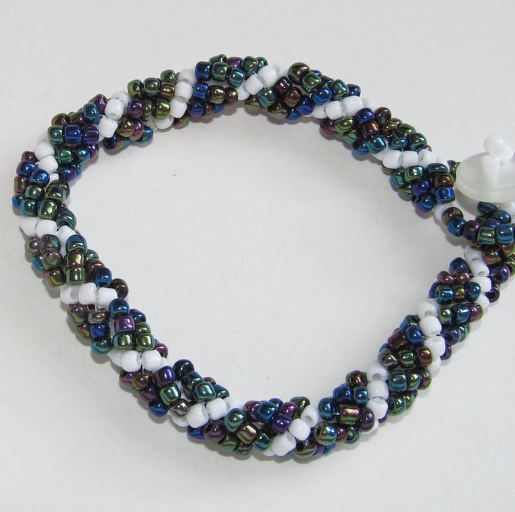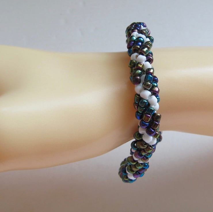 Beautiful, metallic coloured glass seed beads; greens, blues, browns purple and golden seed beads are woven with white seed beads, showing off the spiral design of the weave. These beads look just like anodised aluminium jewellery.