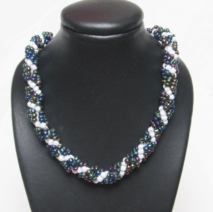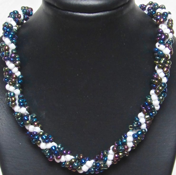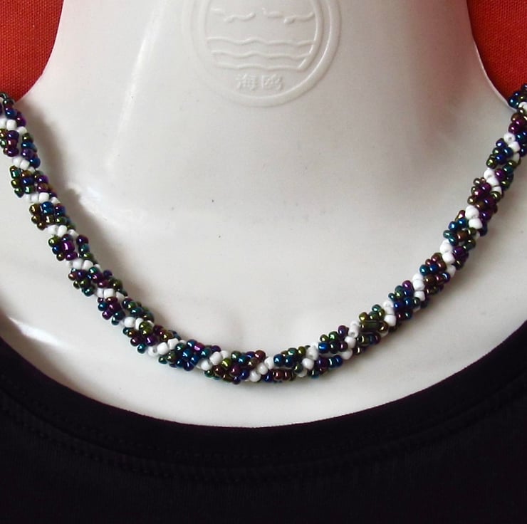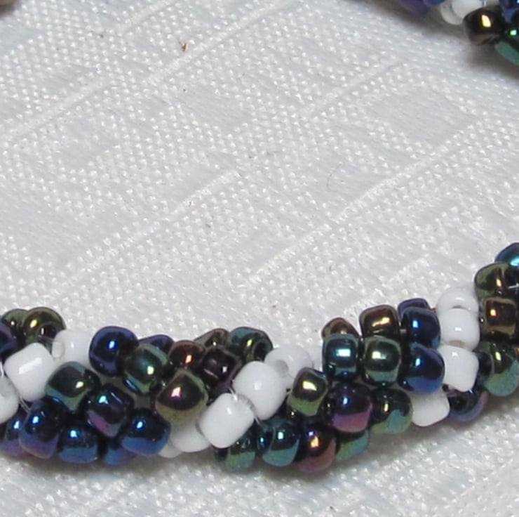 Beautiful, metalic coloured seed beads; greens, blues, browns purple and golden seed beads are woven with white seed beads, showing off the spiral design of the weave.