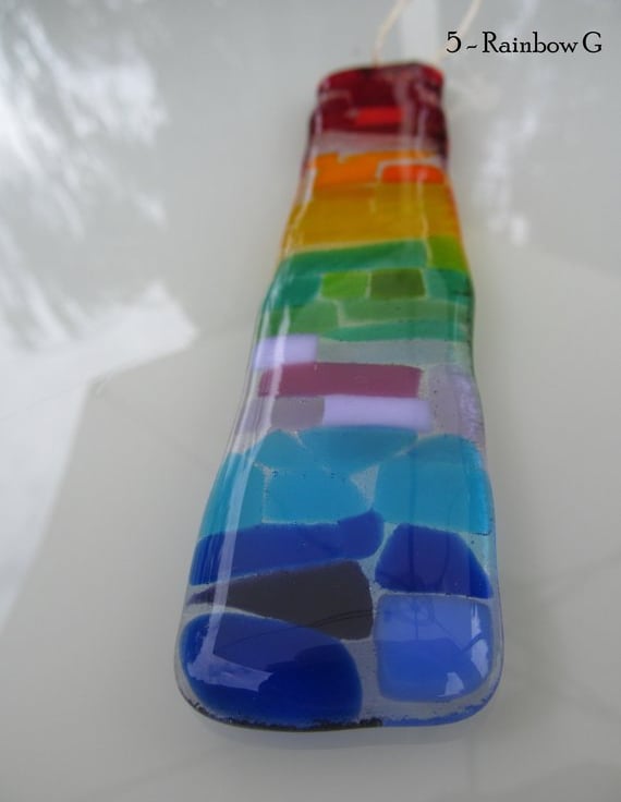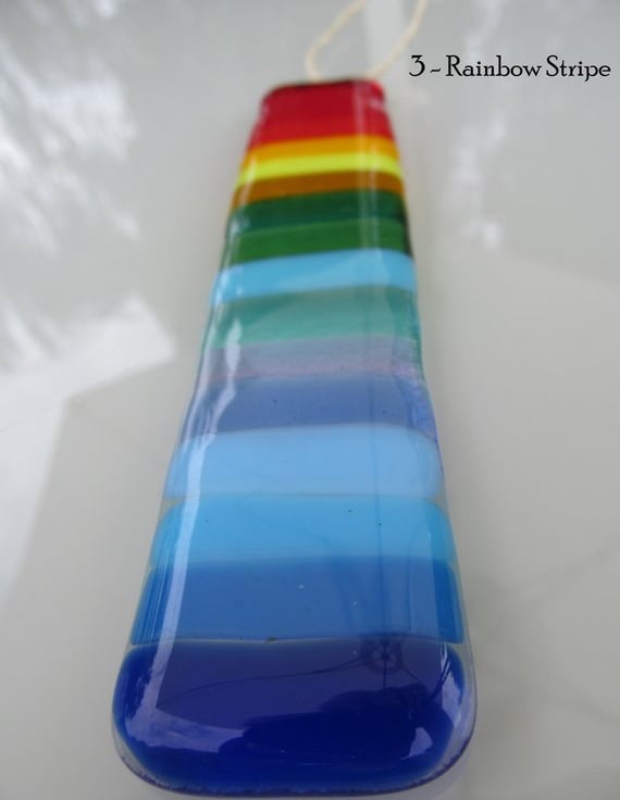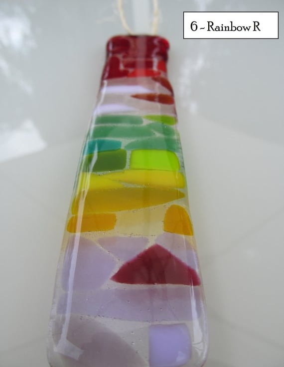 Each one measures approximately 16cm long x 3cm wide and they are ready threaded with twine. We have used bright and vibrant colours of fused glass to catch the light.