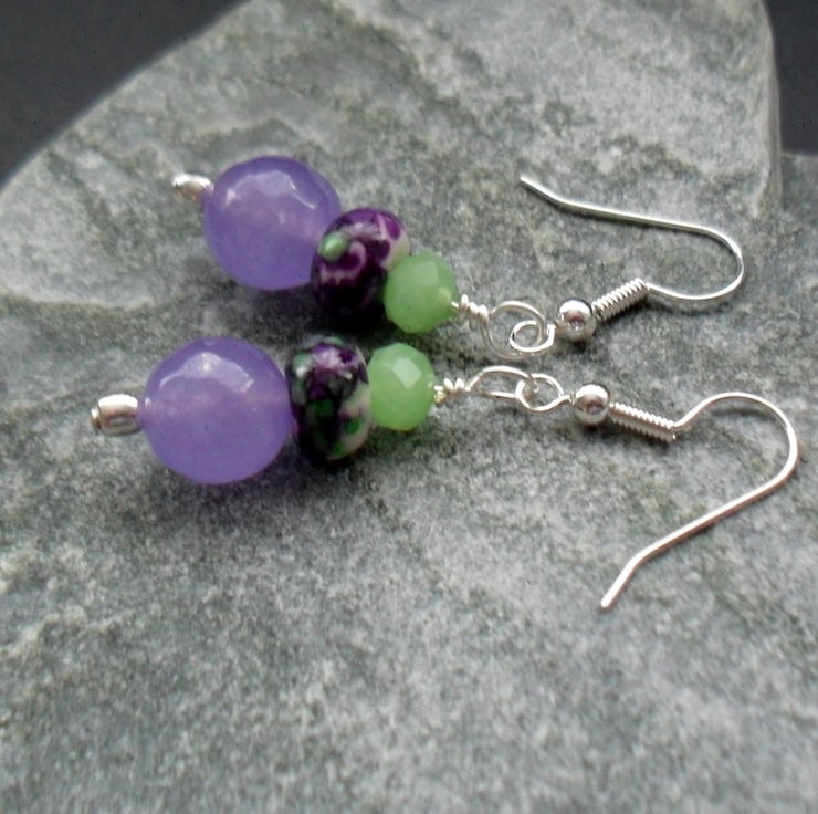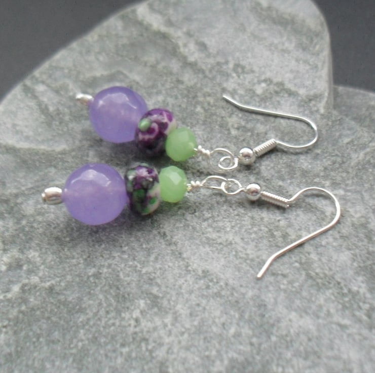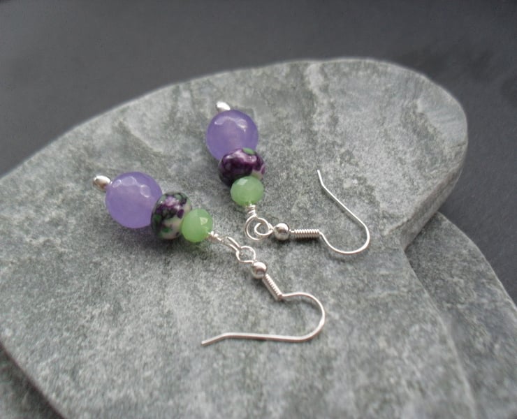Dyed faceted lilac quartz, and rainflower jasper in tones of purple green and pale green glass beads are attached to silver plated ear wires