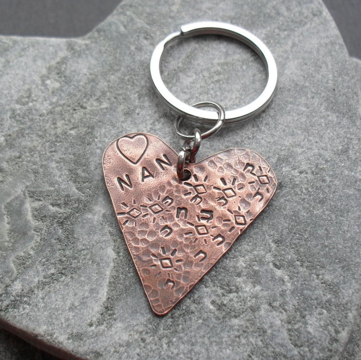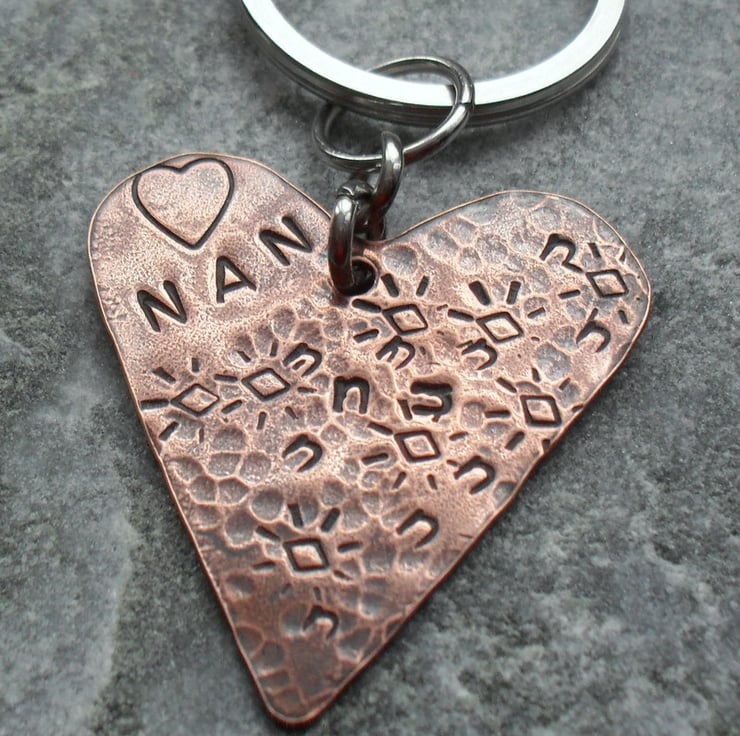 This keyring has been made with a heart shape being cut out of a piece of copper which has been hand stamped with NAN and a flower pattern The copper has then been oxidised to give an aged look.