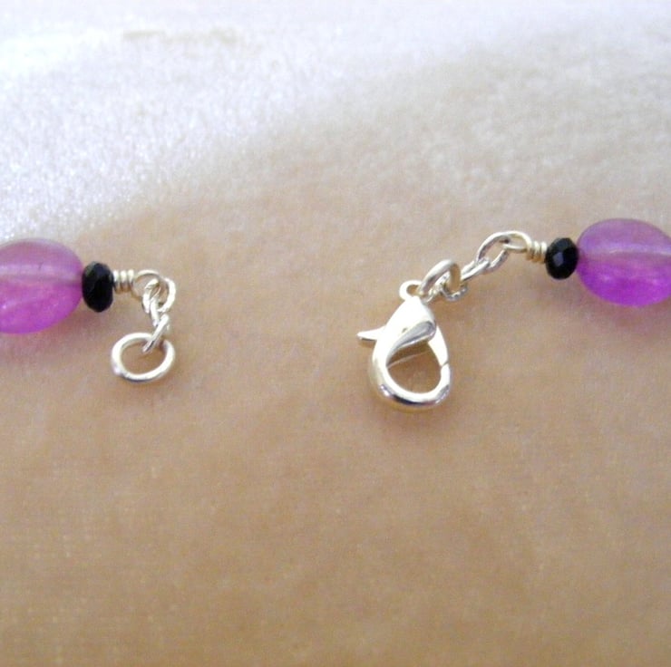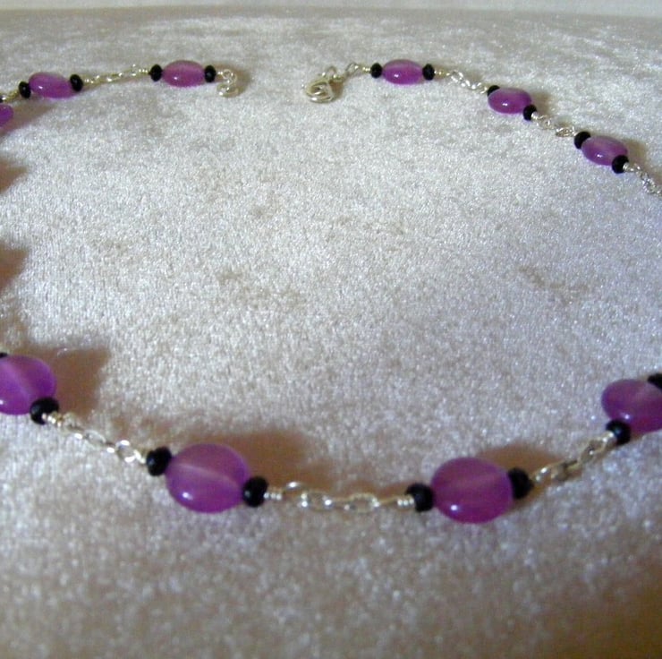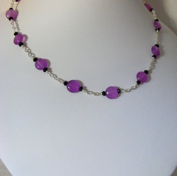 I have made this gemstone necklace using 10 mm purple quartz coins and 3 x 2 mm black faceted agate rondelles which are wire wrapped and linked together with small links of silver plated patterned oval link chain. Clasp is a silver plated lobster clasp. Wire used is silver plated.