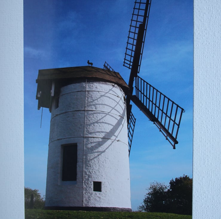 A 6" x 4" portrait photo of Ashton Windmill, Somerset, mounted on a textured card with a blank inner. The windmill was built circa 1760, & in use up to 1927; then renovated in the 1950's.