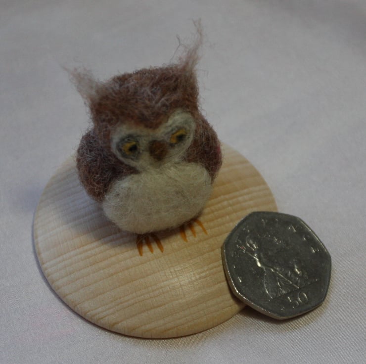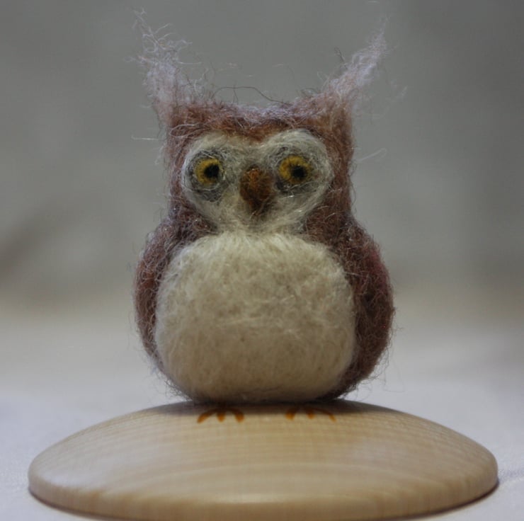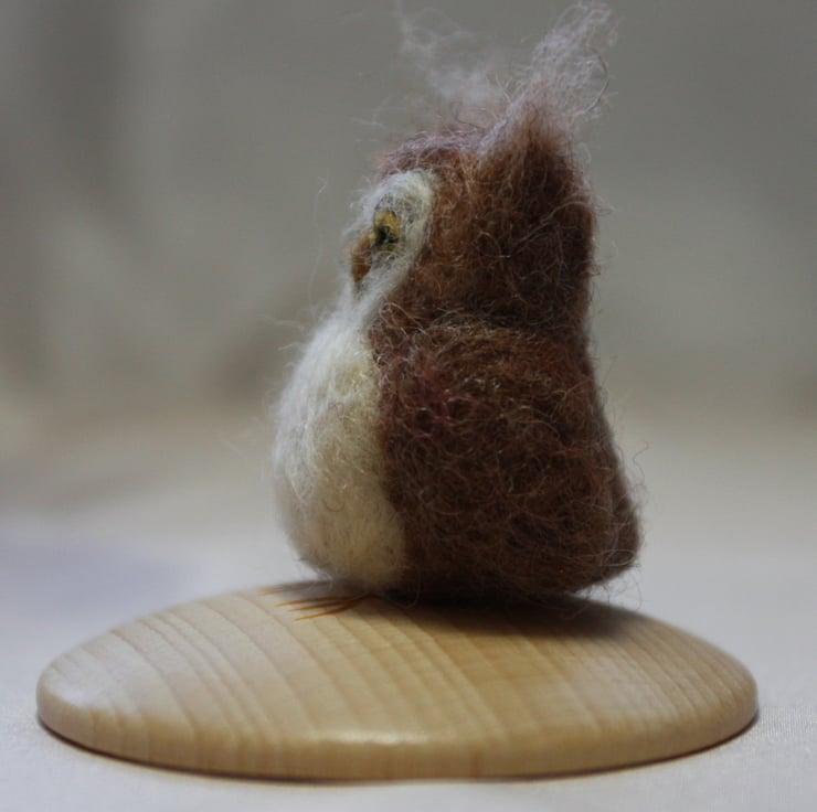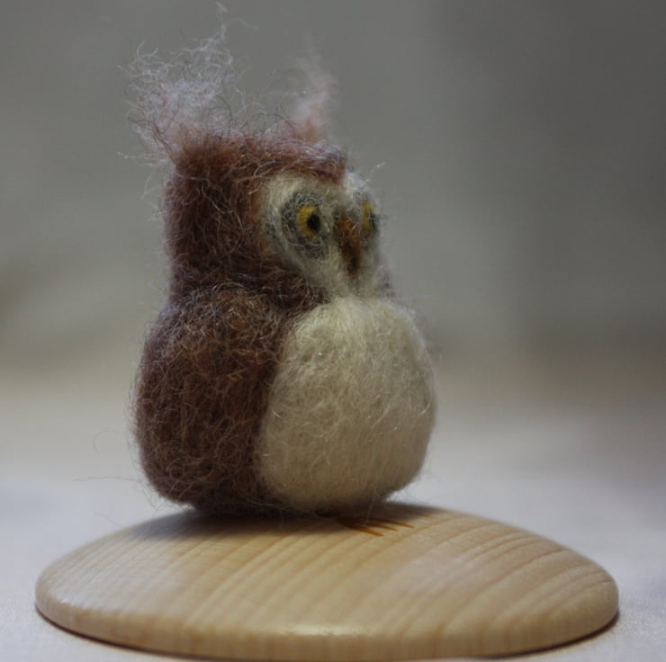 Cute little collectible needle felted owl model on a wooden display base, measuring approx. 6 x 6cm (incl. base and tufts)