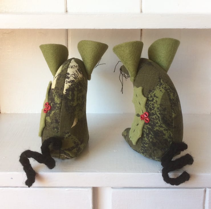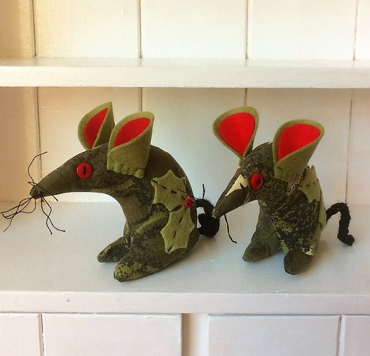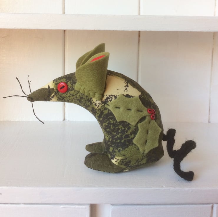 This Mouse mouse has button eyes, felt ears and a plaited wool tail and cotton whiskers, and a button and felt holly decoration. She is approx 10cm tall from the tips of his toes to the top of his ears and approx 11cm from her nose to her bottom.