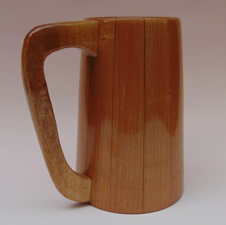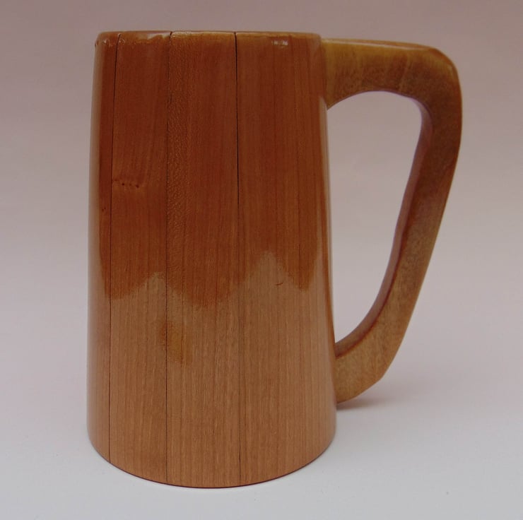 The sides of the vessel have been made from twelve individual cherry staves glued together, similar to how wooden barrels are coopered. The staves are then attached to a solid base and the vessel turned on a lathe.