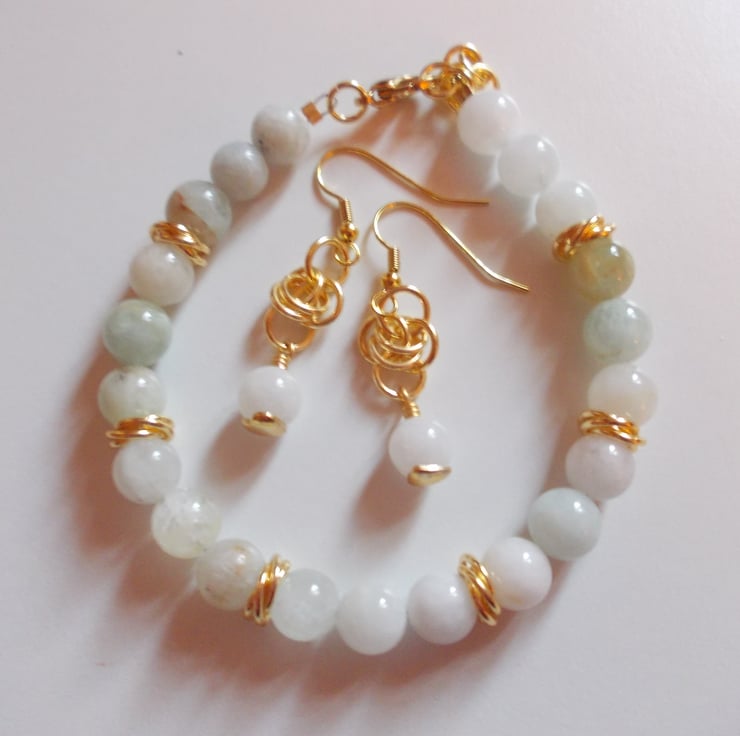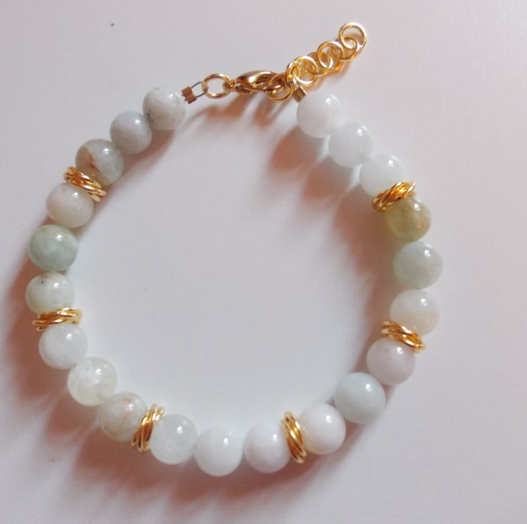 This 7 inch bracelet (not including the extender chain) features multi-tonal aquamarine stones interspersed with gold coloured mobius chainmaille links.