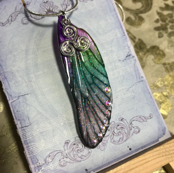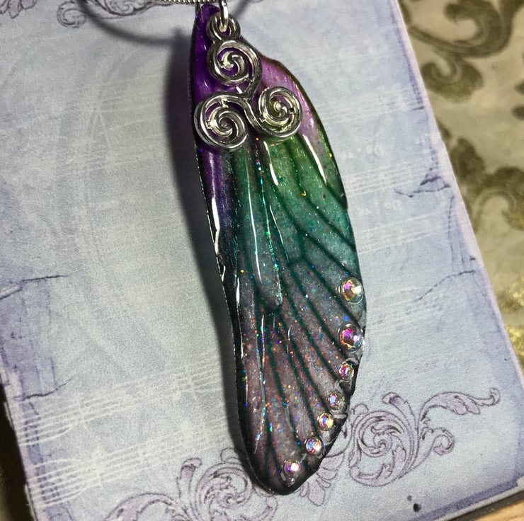 Purple and green Triskelion fairy wing necklace.