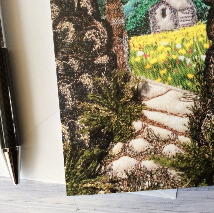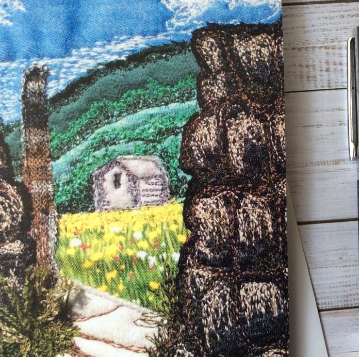 This card is a print of my free motion embroidery landscape. It captures the wild meadows of Muker in the Yorkshire Dales, seen through a gate set in a dry stone wall. The print has really captured the fabric, texture and stitching. Ideal for any occassion. The card measures 12.5 x 18cm and it comes with a white envelop in a plastic cover for protection.