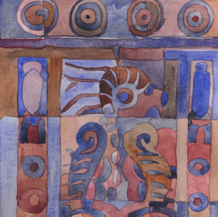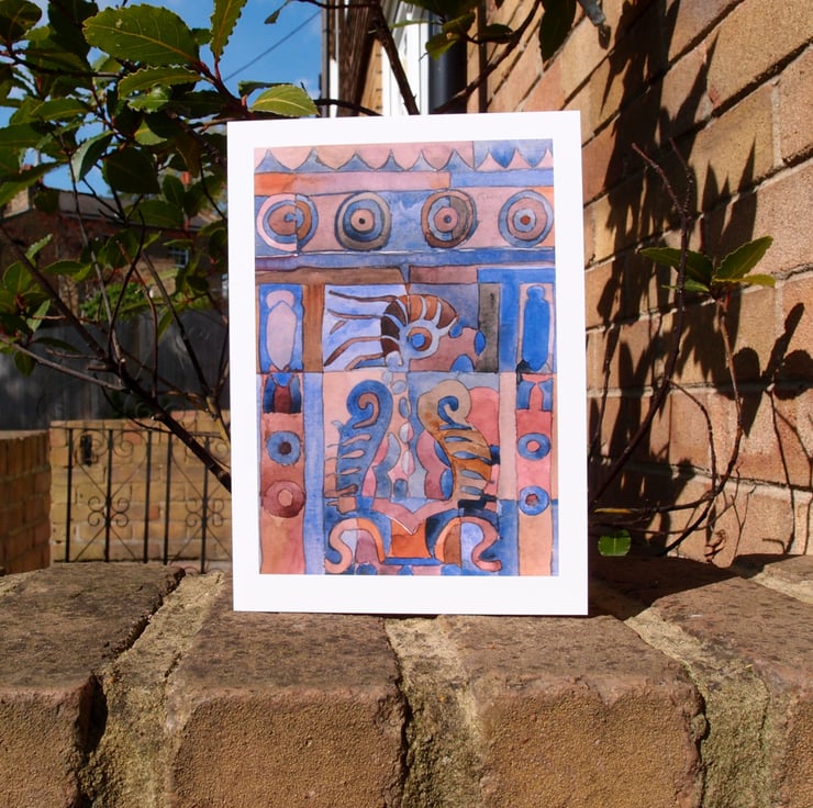 This image is based on a drawing I made of a wall carving at the Palace of Quetzalcoatl, Teotihuacán when we were visiting Mexico in 2004. I completed it a long time after we had got home but when I could still remember the experience of visiting the pyramids and wondering about the people who had made the carvings.