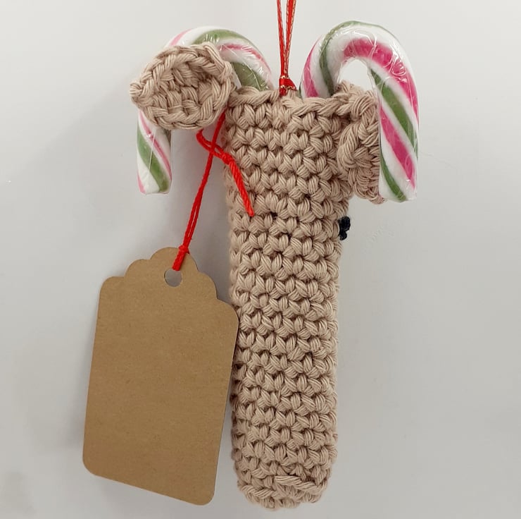 This festive tree decoration would make a lovely keepsake alternative to a Christmas card. It is crocheted in cotton and the eyes have been further secured with a dab of PVA glue. There is a narrow satin ribbon attached and it comes complete with two free candy canes (allergy advice from the original box supplied.) The tag reads ' Have a jolly Christmas! ' on one side and is blank on the other for your own greeting. The reindeer head measures approximately 10.5 cm in length and comes wrapped in tissue in a labelled PIP (Postage in Proportion )box all ready to be given or posted on.