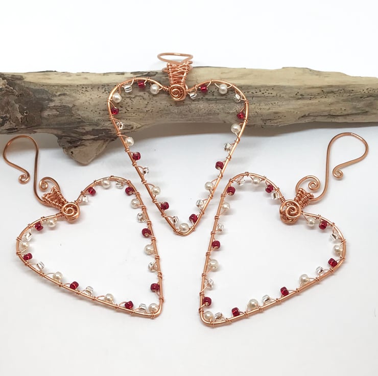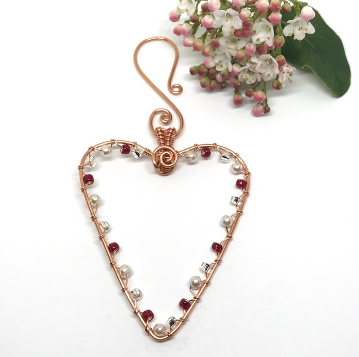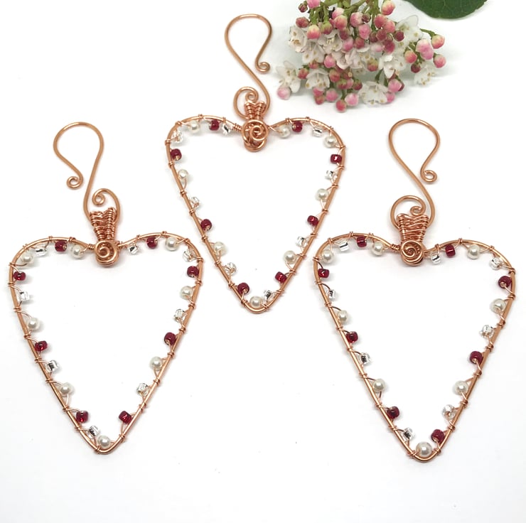 I have formed copper wire into heart shapes and wrapped pretty beads around the hearts with white glass pearls, red and silver seed beads. The hearts have a wire weave detail on the bail. Each heart is individually handcrafted so each heart is uniquely different.