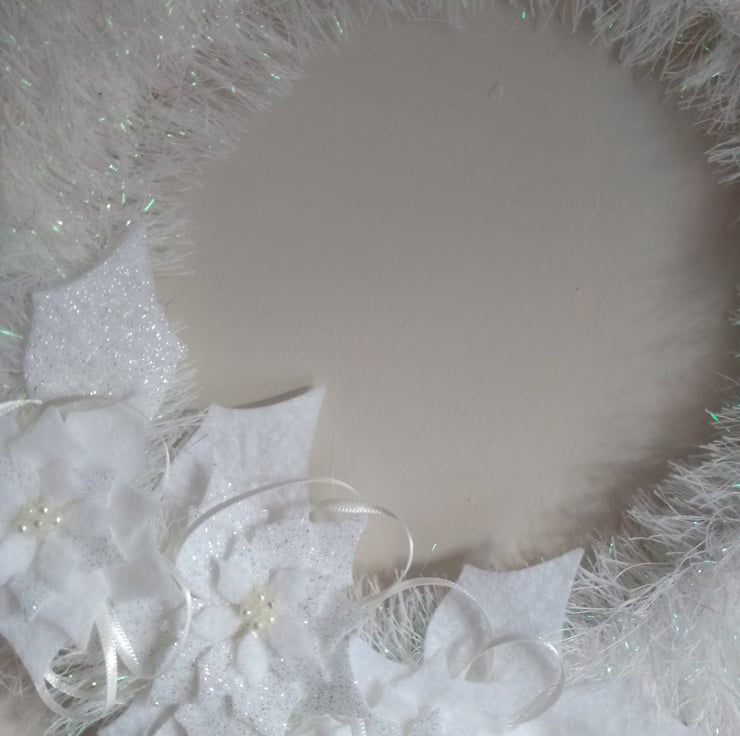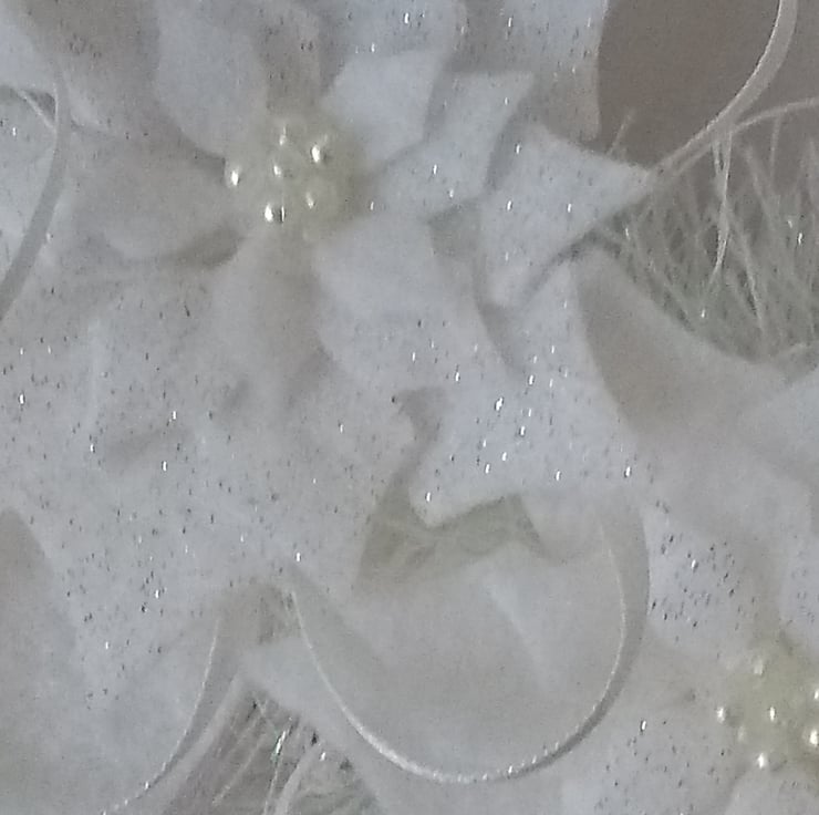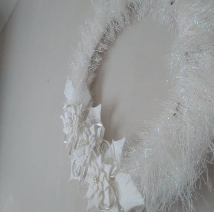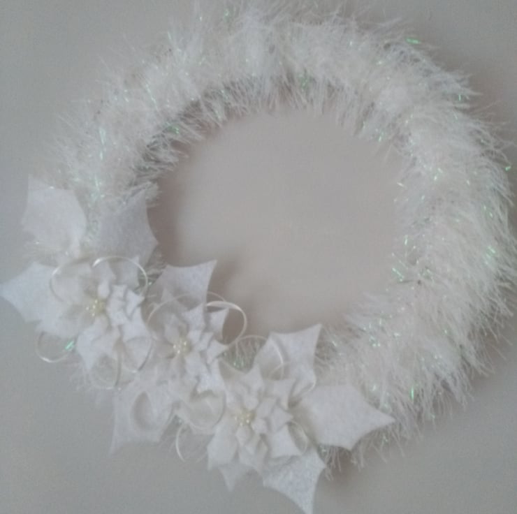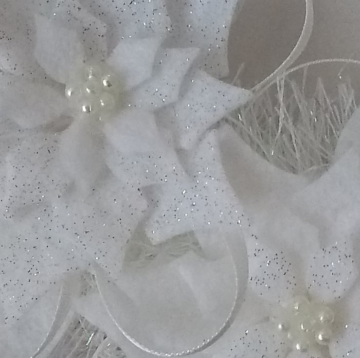 Consisting of a copper wire base which had been wrapped with a quality glittery chunky polyester yarn. Decorated with three die cut poinsettias from white and white glittered felt. Loops of white satin ribbon enhances the pretty flowers and finished off with pearl beads in the centre's.