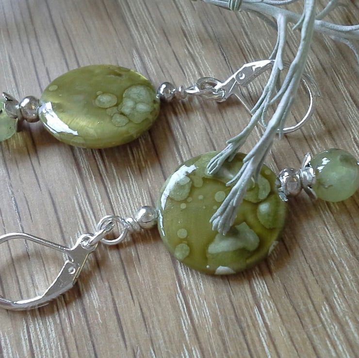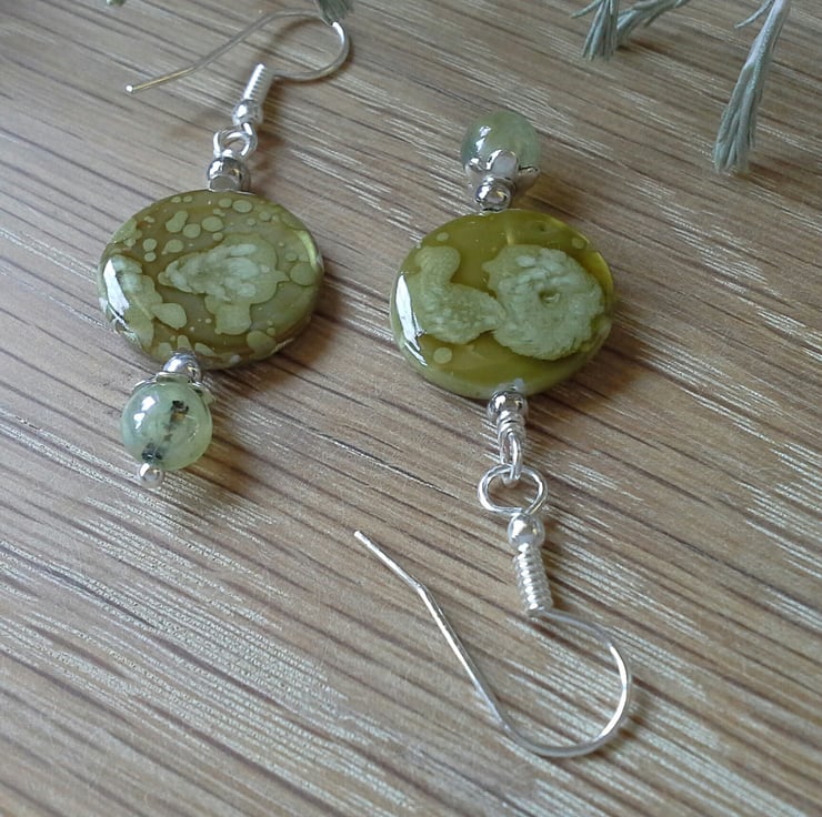 A sweet pair of earrings designed and hand crafted using quality Prehnite round gemstones with an unusual printed shell coin cut gemstones. They have have been created using all quality silver plated findings.