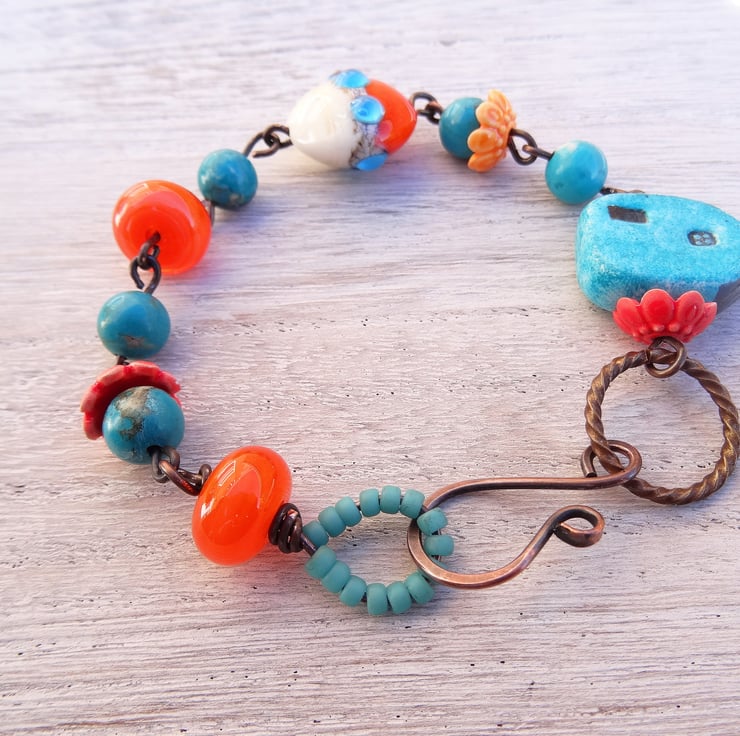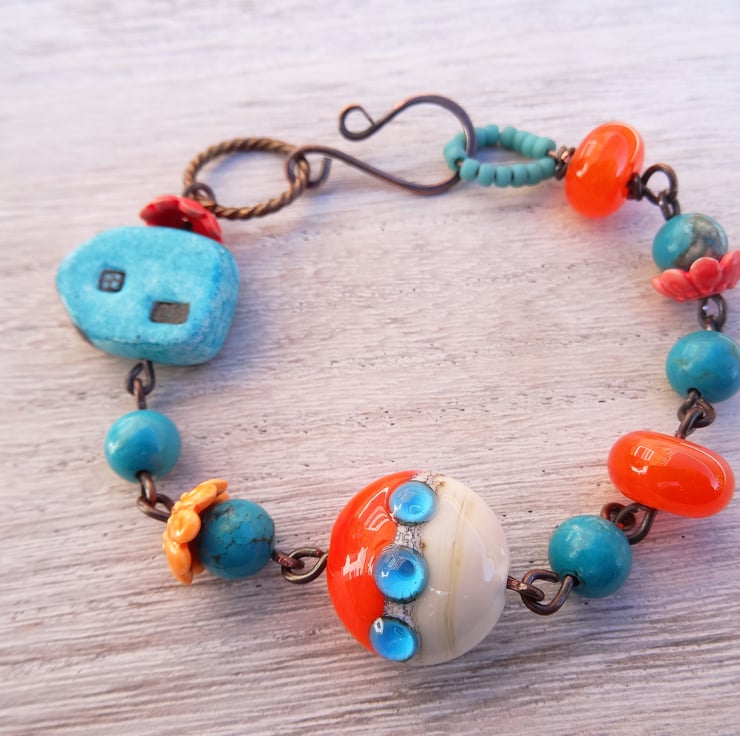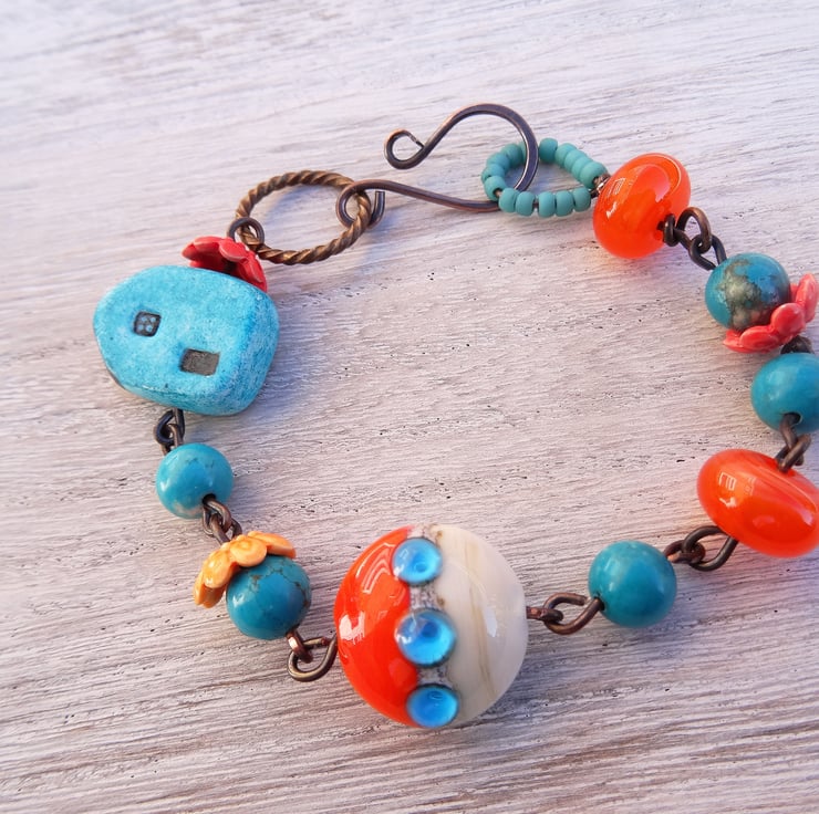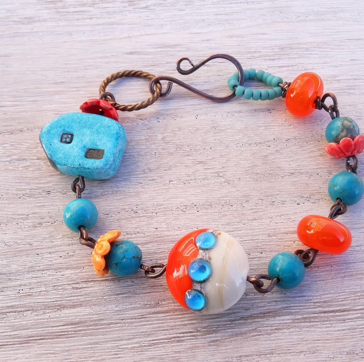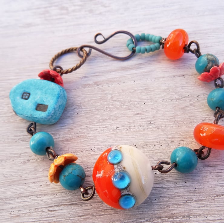 This is a lovely bracelet made with a variety of handmade beads, including a 20mm lampwork glass lentil bead in cream and orange with turquoise raised dots. A turquoise 20 x 15mm polymer clay house bead by Ditsy Blue and 8mm turquoise round beads, orange lampwork rondelle beads and ceramic, floral bead caps.The bracelet measures 8 inches (20cm) and closes with a handmade copper hook clasp by Midnight Star Design.