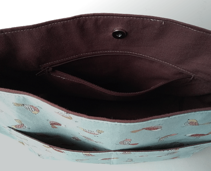 The lining is brown and this is also used for the handle. A magnetic snap provides closure for the main body of the bag. Inside is a roomy zip pocket. The outside has a double slip pocket, handy for those things you want to access quickly, like a travel pass.
