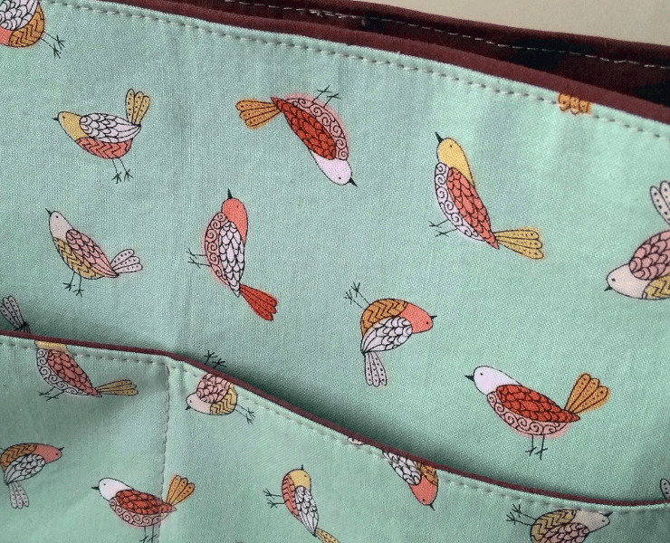 This fabric is very pretty, warranting a close-up photo, so you can see the different birds in shades of terracotta, peach & mustard. The background is a mint green.