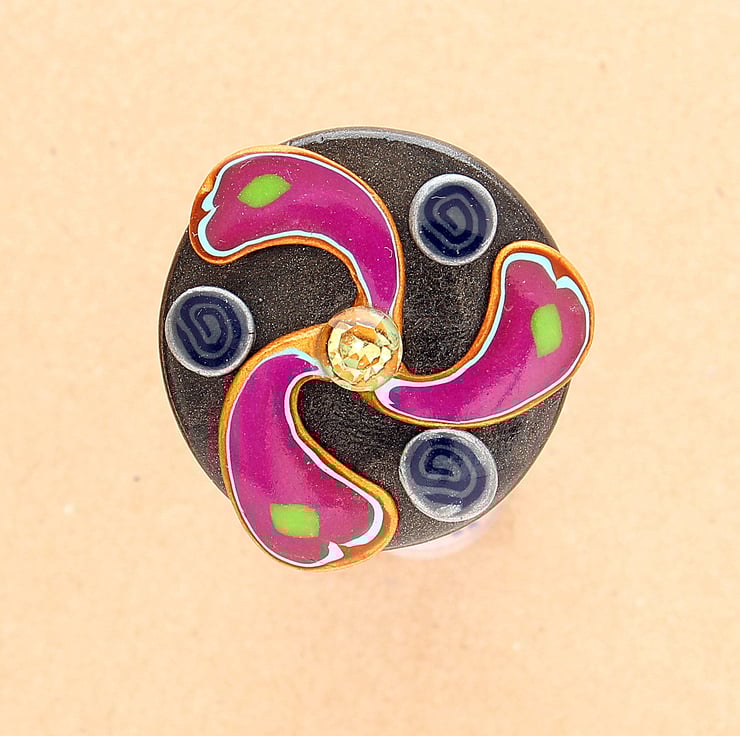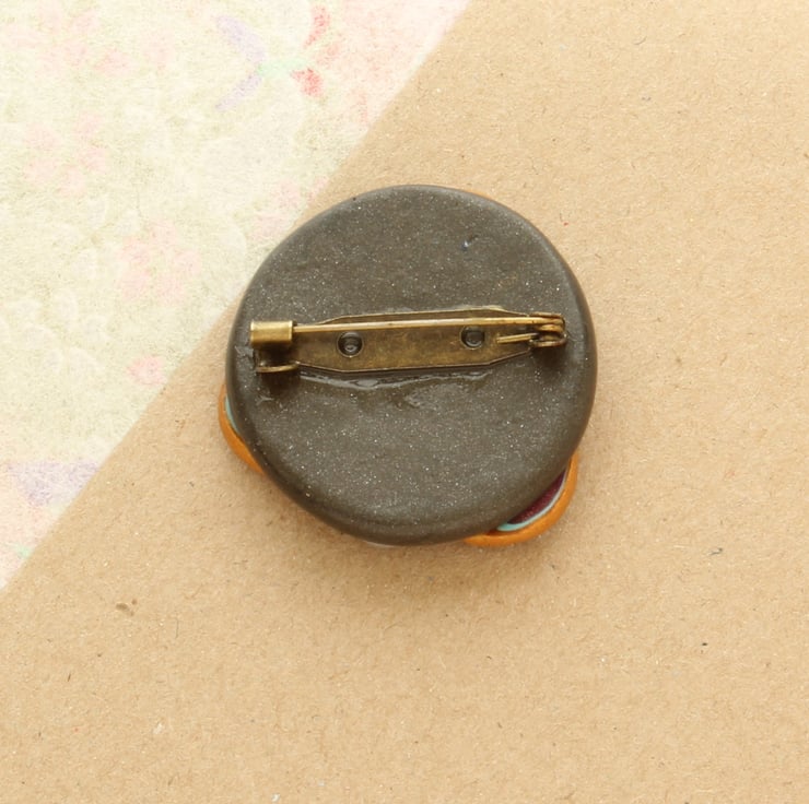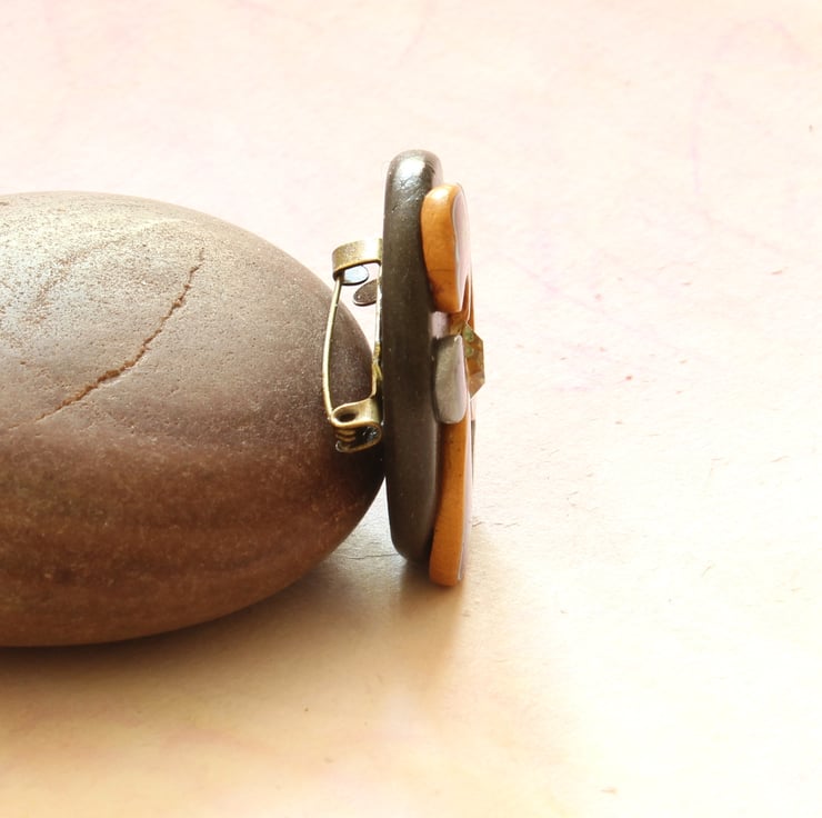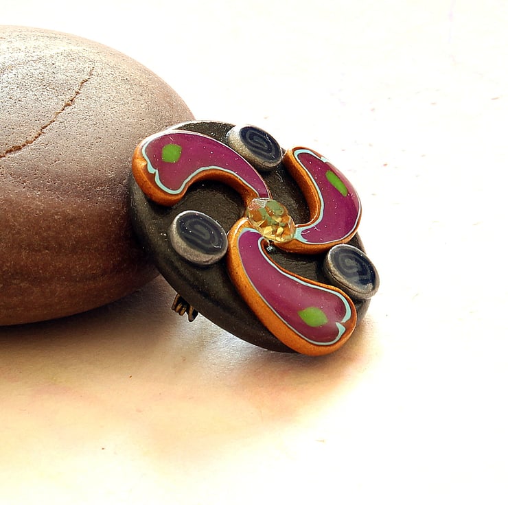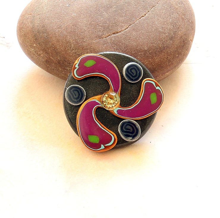 Made from polymer clay, excellent, durable stuff that will keep its fine tones forever. It has a crystal of yellow cut glass in the middle. It measures 4cm across. A metal brooch pin is firmly attached.