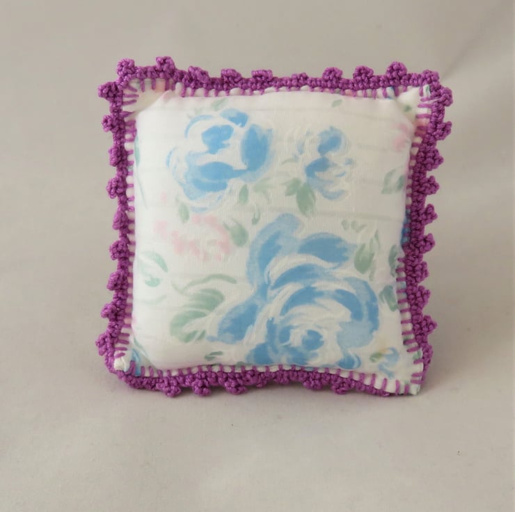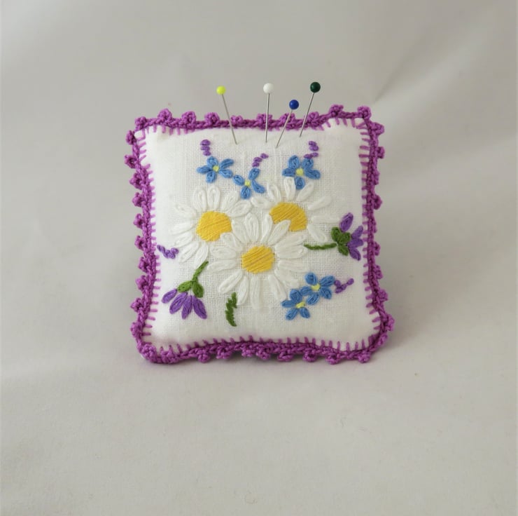A pretty daisy design embroidery has been reclaimed from a vintage tray cloth and used for the front panel of this pincushion. The back of the pincushion has been cut from recycled fabric. The back and front panels have been blanket-stitched together using a toning purple crochet thread. A picot edging has been crocheted into the blanket stitch.
