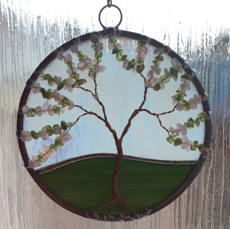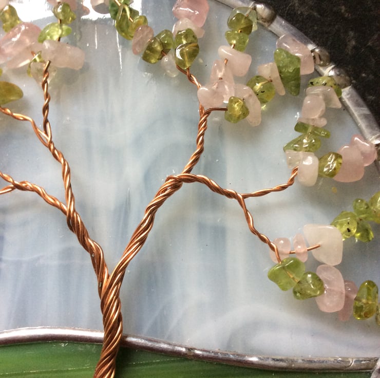 This suncatcher has a twisted copper wire tree with its branches covered in polished rose quartz and peridot gemstone chips.