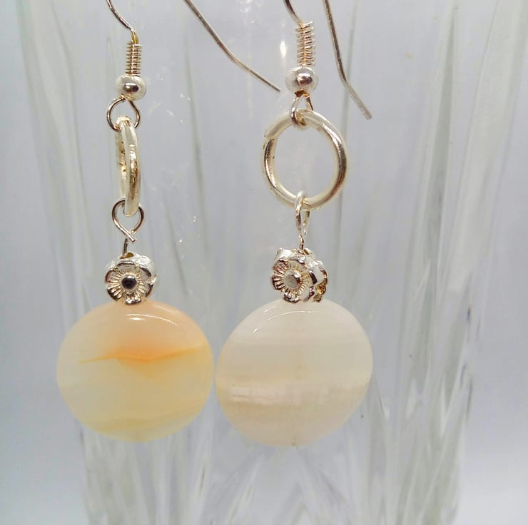 The earrings are made using a 20 mm round honey jade coin bead and a 6 mm round silver flower spacer bead. They are hung on silver plated ear wires and they have a drop of 4 cm from the base of the ear wire.