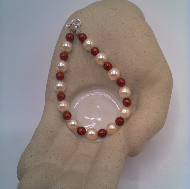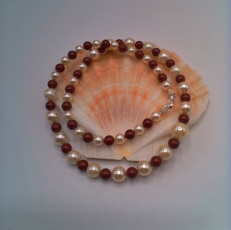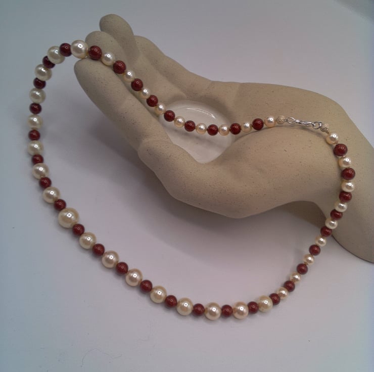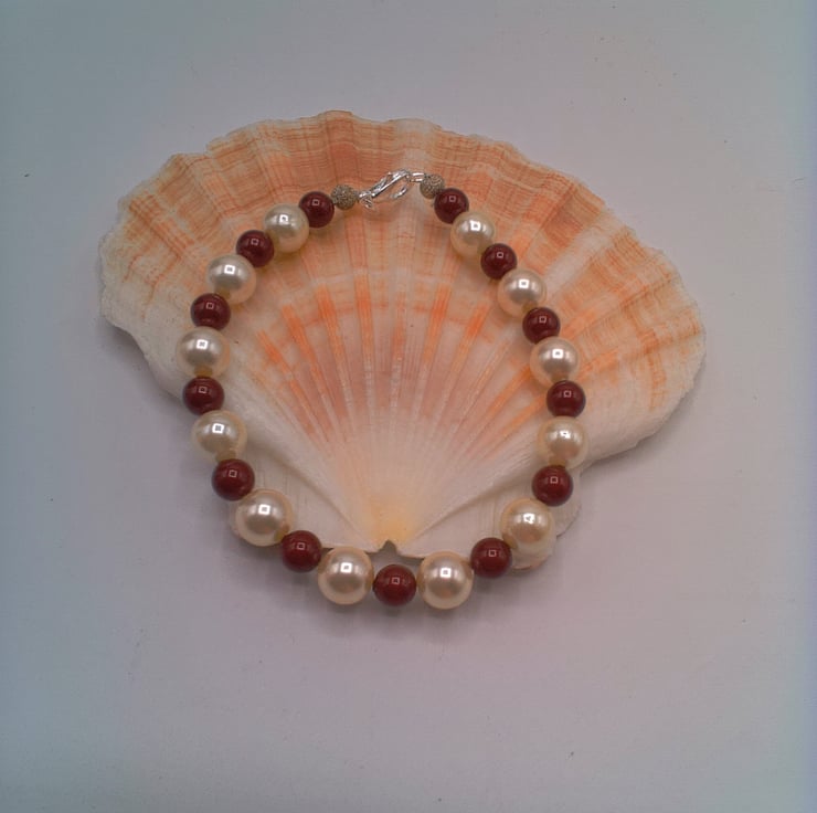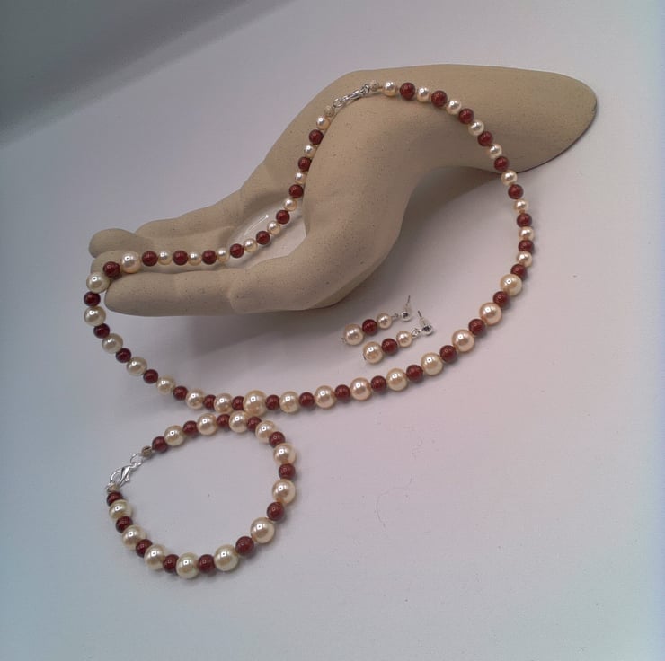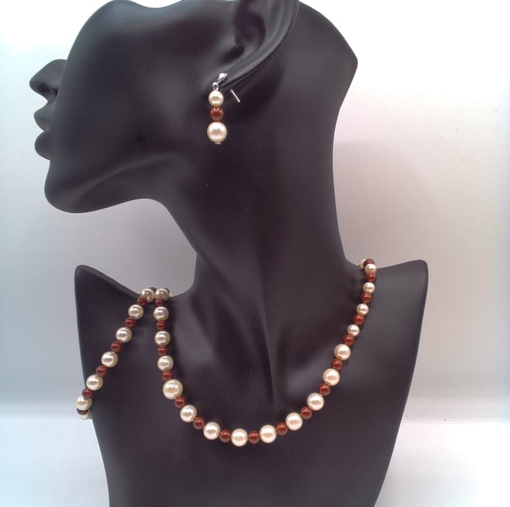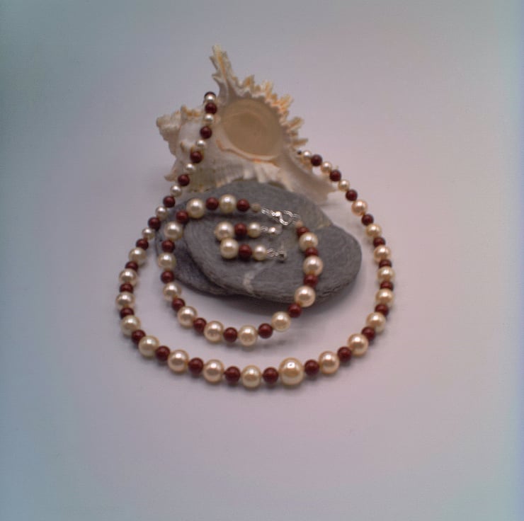 Maroon and Cream Pearl Necklace Bracelet and Earrings Set, Pearl Jewellery, 3 Piece Jewellery Set, Pearl Necklace, Pearl Bracelet, Pearl Earrings, Gift for Her, Birthday Gift, Anniversary Gift, Pearl Anniversary Gift