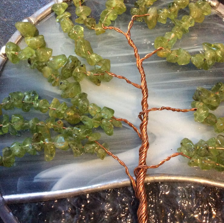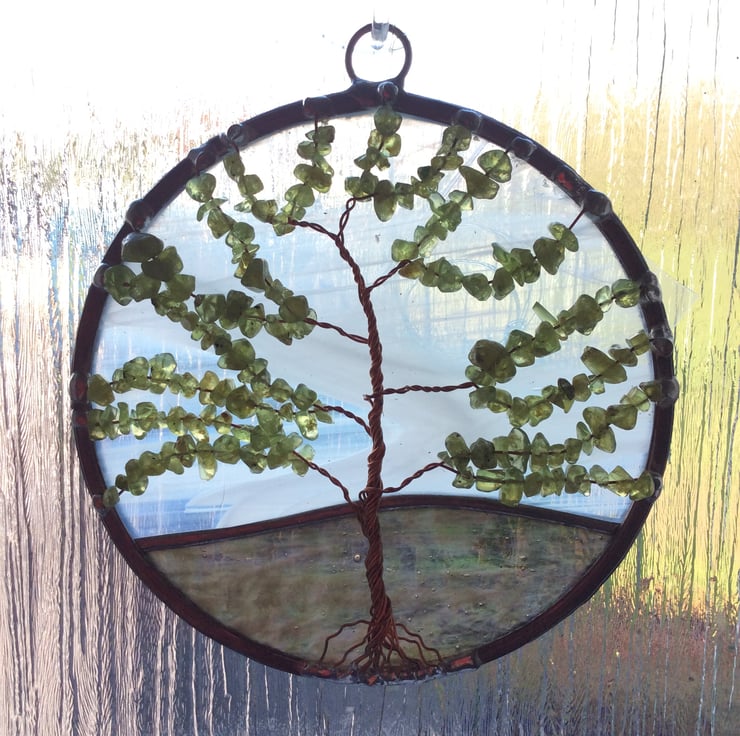 This suncatcher has a twisted copper wire tree with its branches covered in polished peridot gemstone chips.