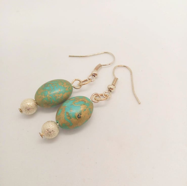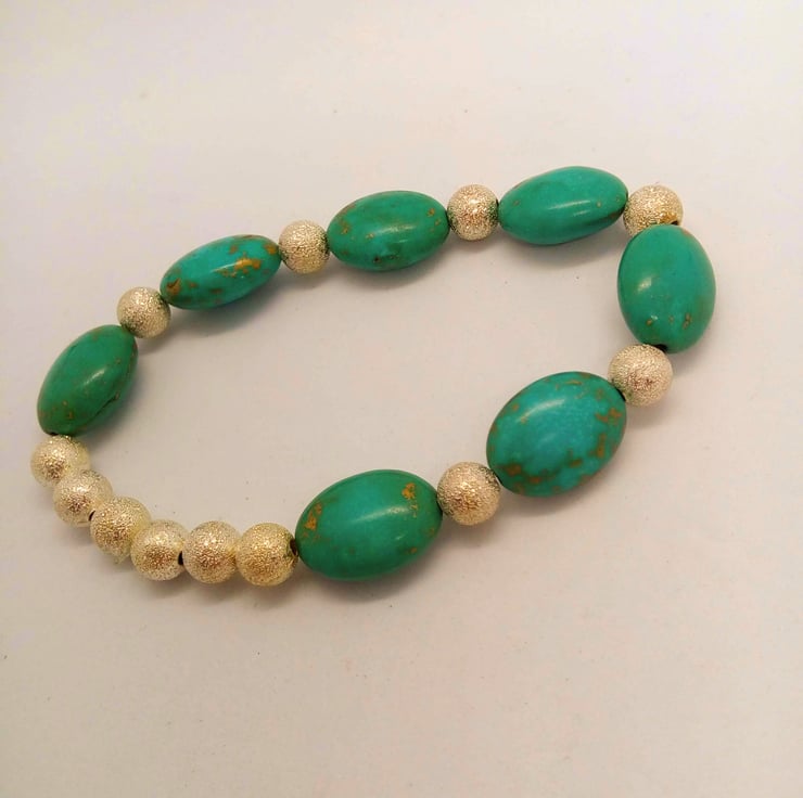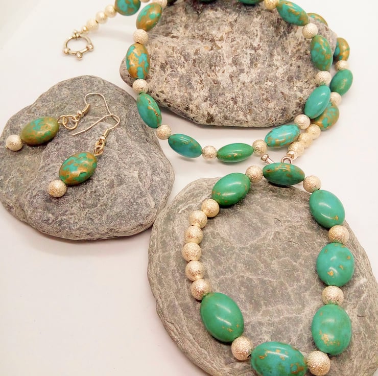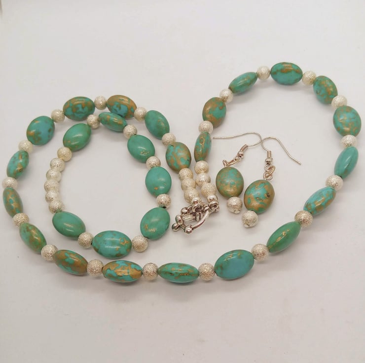 This jewellery set is made using oval turquoise beads, with lots of lovely inclusions and silver stardust beads. The necklace has a silver plated toggle clasp, the bracelet is elasticated using jewellers elastic and the earrings are silver plated wires.