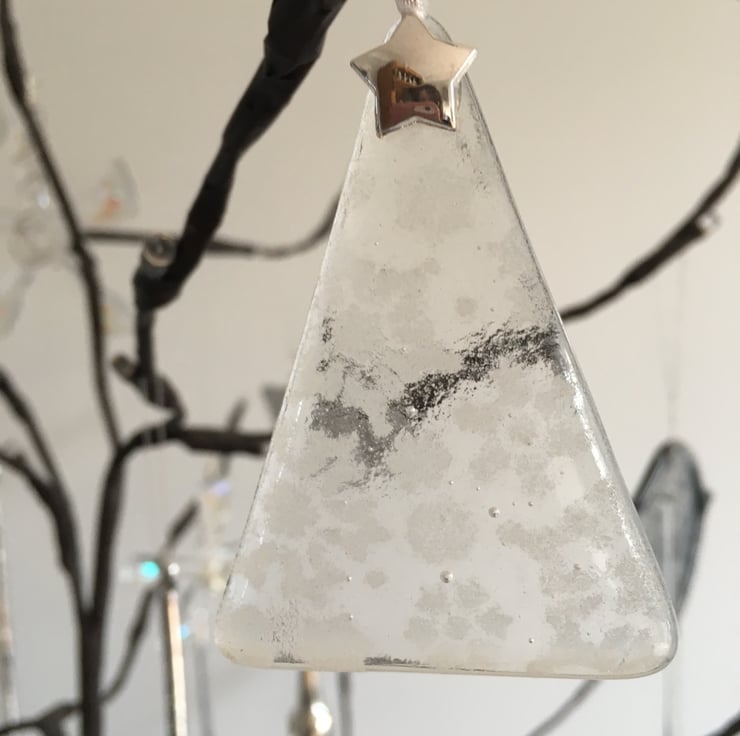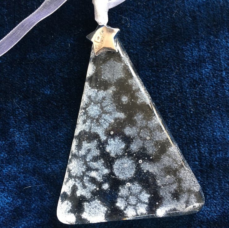 Beautiful clear fused glass tree shaped Christmas tree decoration with a pattern of snowflakes overfused in white. This decoration measures approx 6cm and would make a lovely addition to your decor this Christmas.