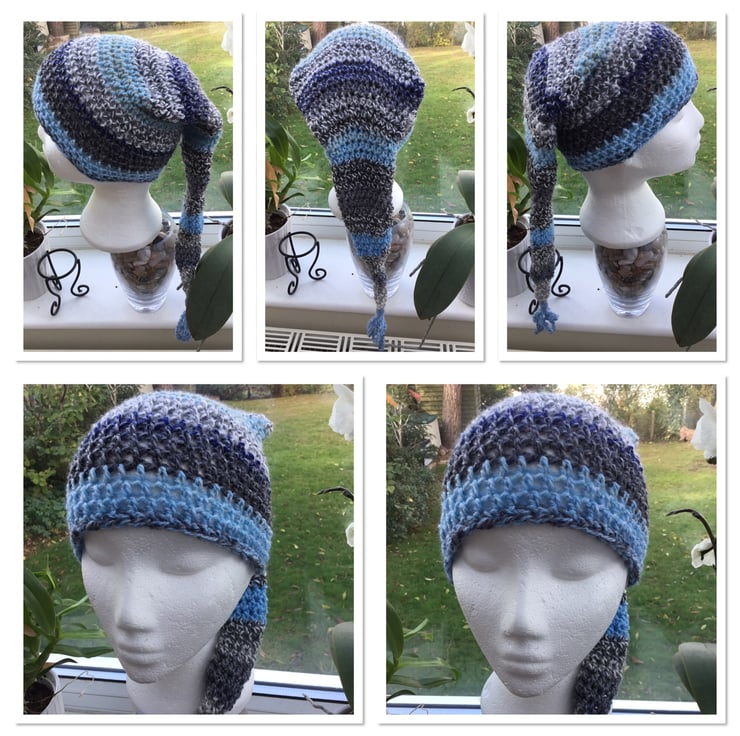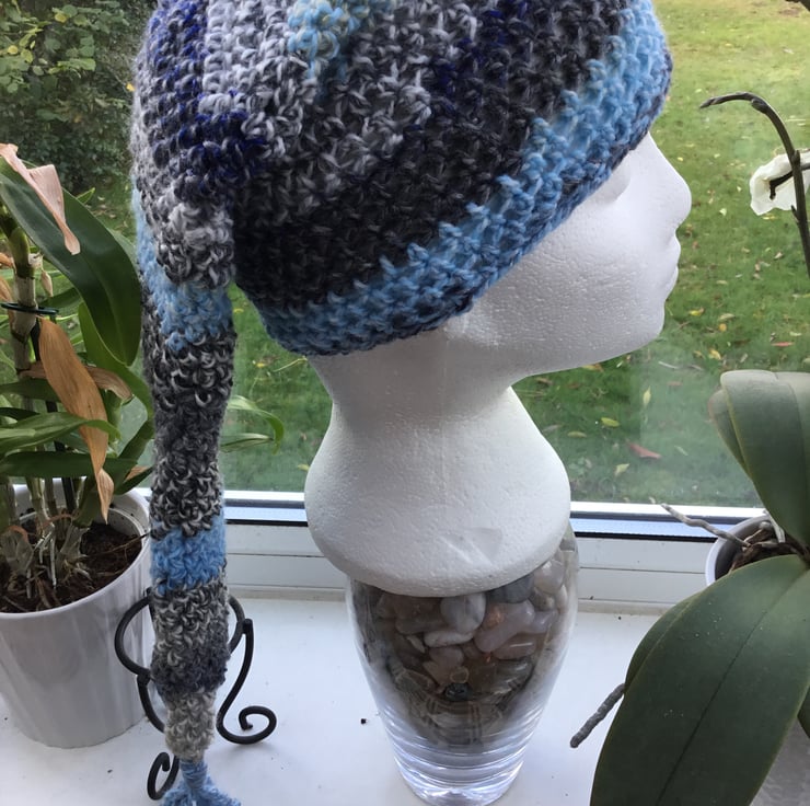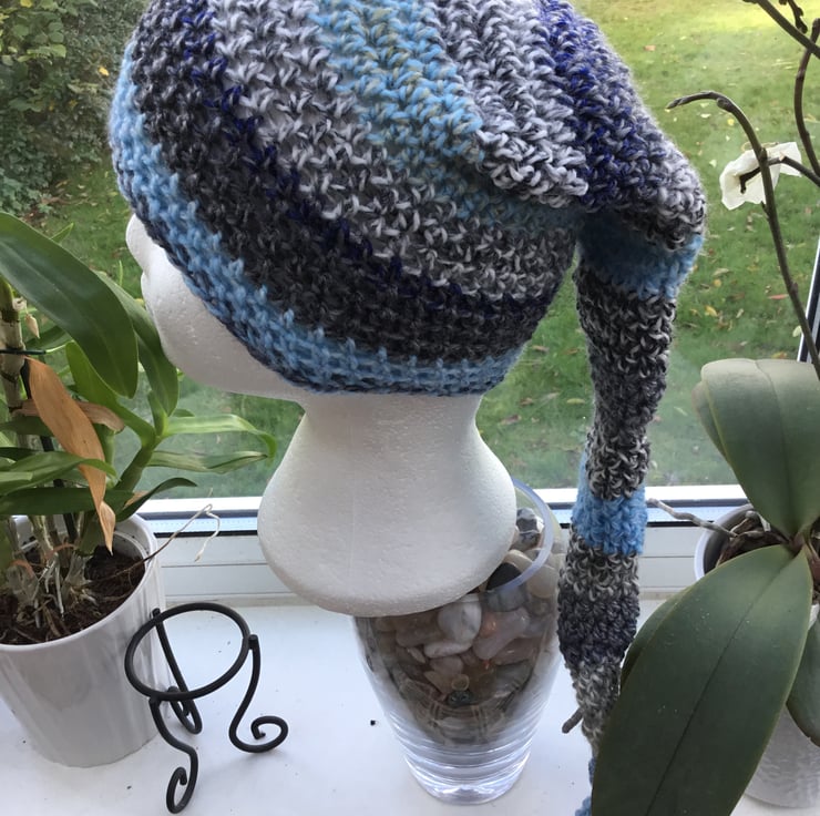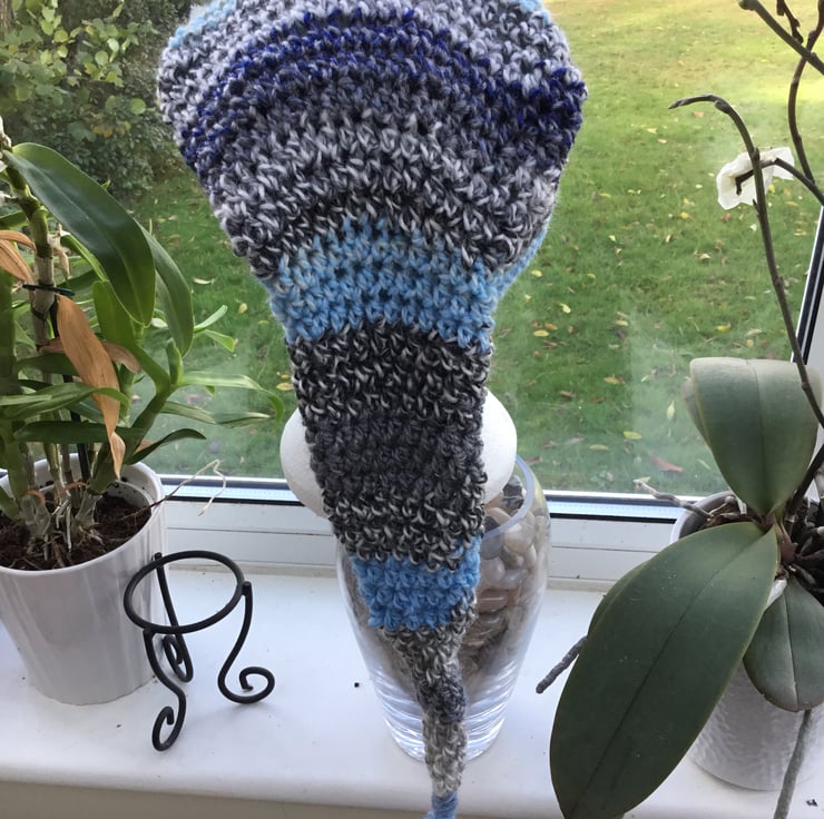 The long length allows the tail element dangle down the back, and the hat worn it at a jaunty angle, slouchy style, or with a turn over, totally up to you!