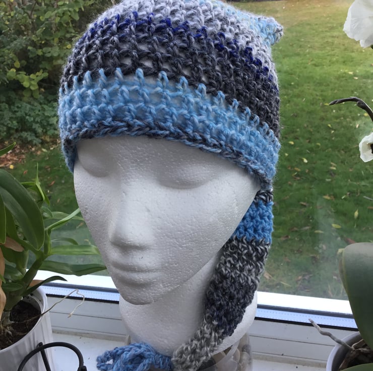 Crocheted in Acrylic & Wool blend yarns, the hat is crocheted in repeating striped of sky blue, slate blue, white and grey, with sky blue loopin yarn forming the tassels.