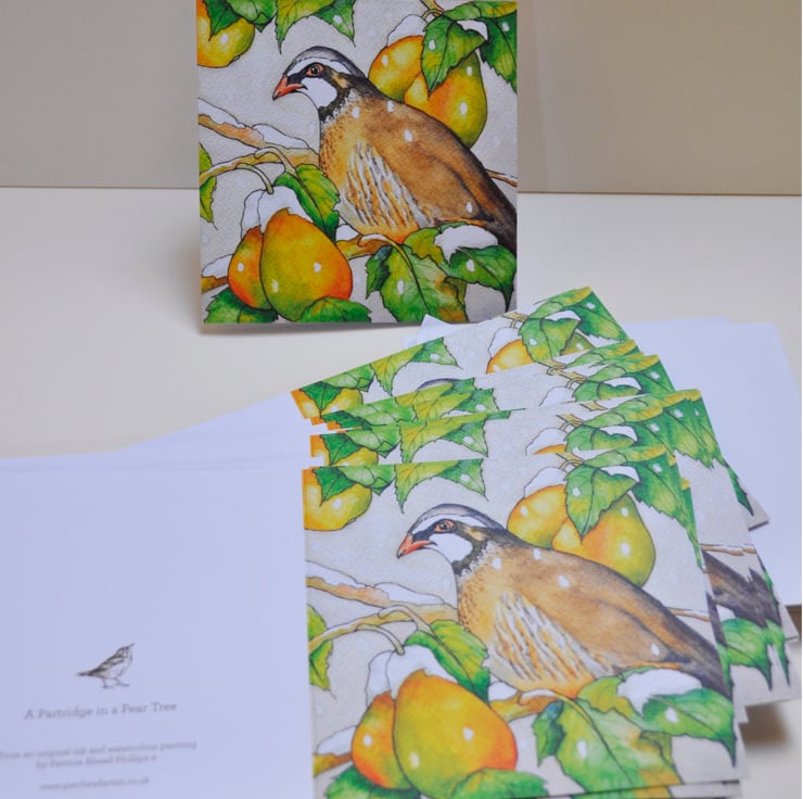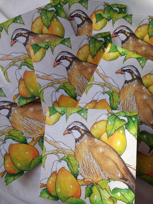 A colourful Christmas card from an original ink and watercolour painting of a 'Partridge in a Pear Tree' in the snow. Printed on 310 gsm quality card with a white envelope and cellophane wrapped. Left blank for your own message.