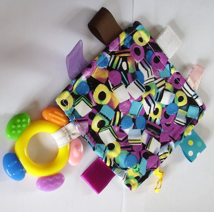 A cheerful cotton cloth (5"x5") with a multicoloured soft silicone teether attached. The tagged cloth has liquorice allsorts on both sides and the tags are of various colours, widths and textures. They are all double stitched for security. The teether is sourced from a reputable dental supplier and the whole can be machine washed in cool water. It is CE marked.