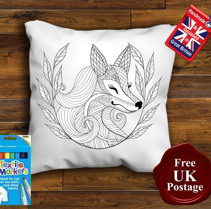 Fox Colouring Cushion, Colouring in pillow Graffiti pillow Cover, With or Without 8 x Fabric Pens, Choice of sizes, Handmade with a zip for cover removal.