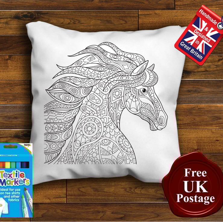 Horse Colouring Cushion Cover, Colouring in pillow Graffiti pillow Cover, With or Without 8 x Fabric Pens, Choice of sizes, Handmade with a zip for cover removal.