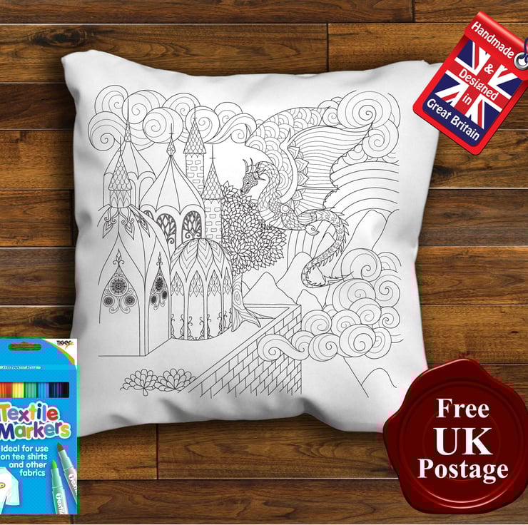 Dragon Colouring Cushion Cover, Colouring in pillow Graffiti pillow Cover, With or Without 8 x Fabric Pens, Choice of sizes, Handmade with a zip for cover removal.