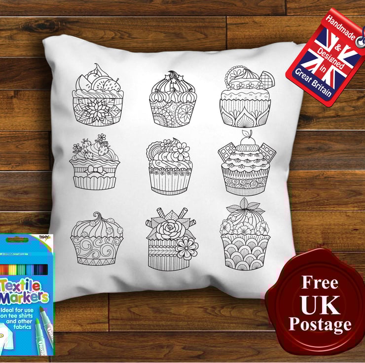 Cupcakes Colouring Cushion Cover, Colouring in pillow Graffiti pillow Cover, With or Without 8 x Fabric Pens, Choice of sizes, Handmade with a zip for cover removal.