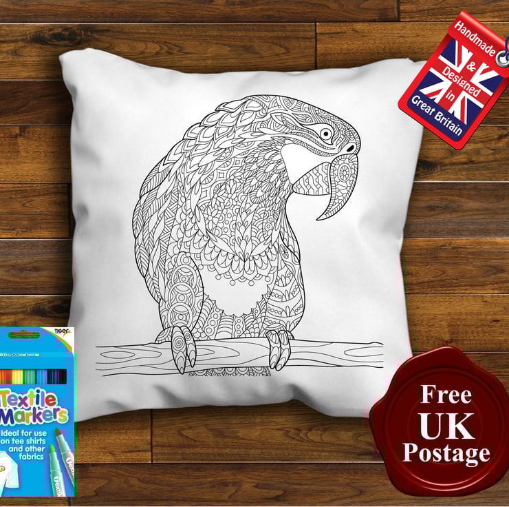 Parrott Colouring Cushion Cover, Colouring in pillow Graffiti pillow Cover, With or Without 8 x Fabric Pens, Choice of sizes, Handmade with a zip for cover removal.