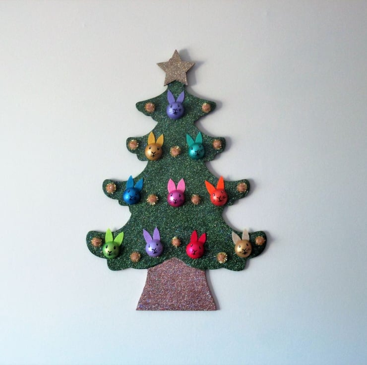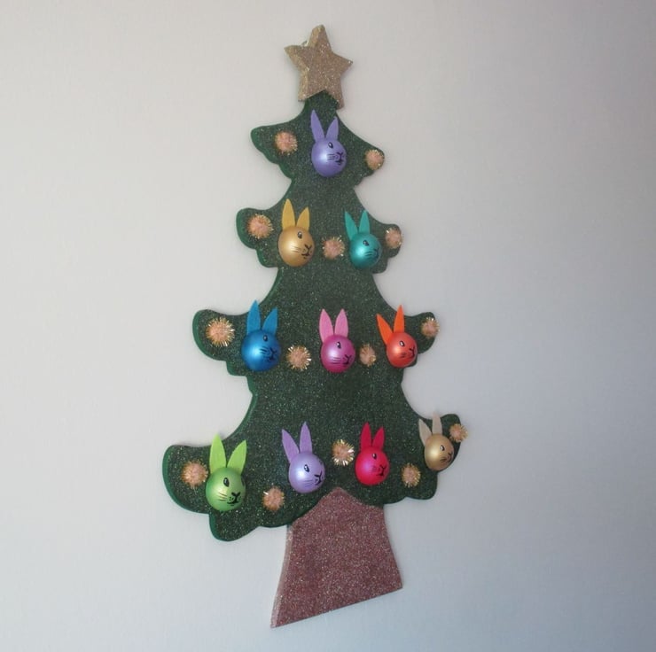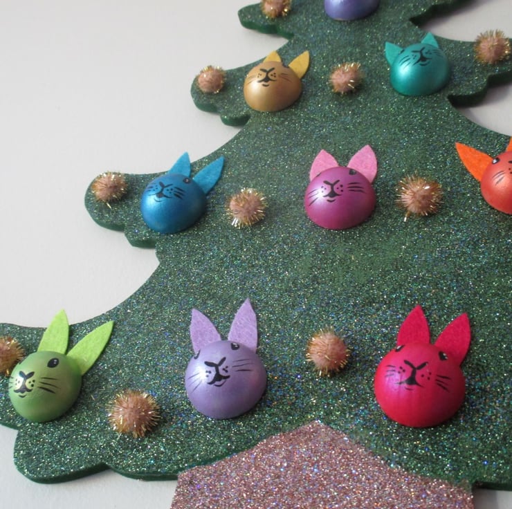 The bunny head baubles are all hand painted, and the ears cut by hand (I intentionally make the ears all a little different, as that's how real bunnies are). Between the rabbit head baubles are little pom poms which have been firmly glued on.