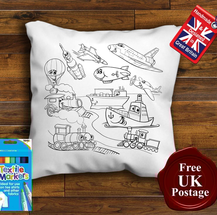 Transport Colouring Cushion Cover, Colouring in pillow Graffiti pillow Cover, With or Without 8 x Fabric Pens, Choice of sizes, Handmade with a zip for cover removal.