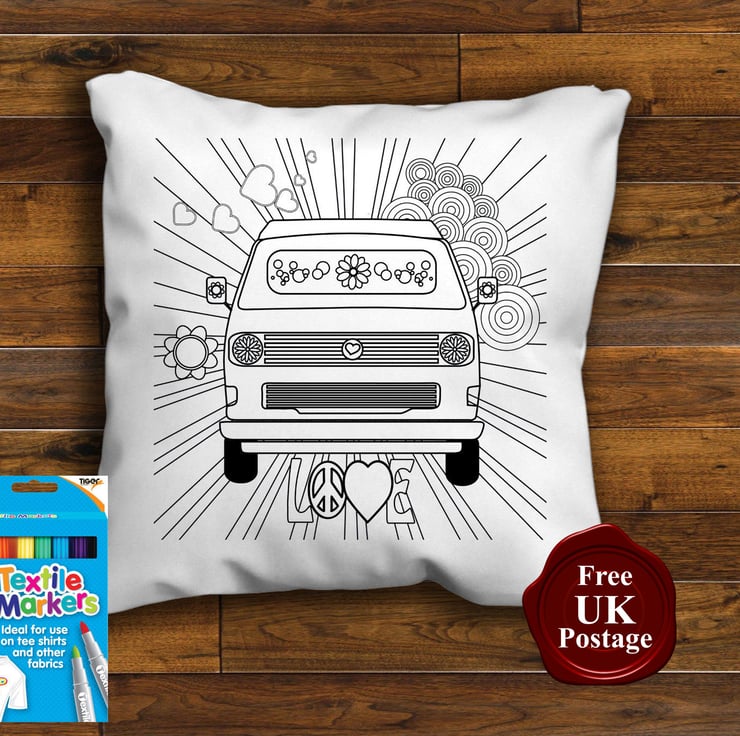 T25 Campervan Colouring Cushion Cover, Colouring in pillow Graffiti pillow Cover, With or Without 8 x Fabric Pens, Choice of sizes, Handmade with a zip for cover removal.