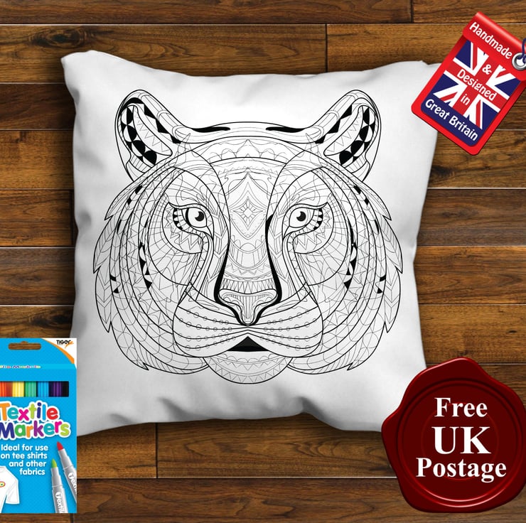 Tiger Colouring Cushion Cover, Colouring in pillow Graffiti pillow Cover, With or Without 8 x Fabric Pens, Choice of sizes, Handmade with a zip for cover removal.